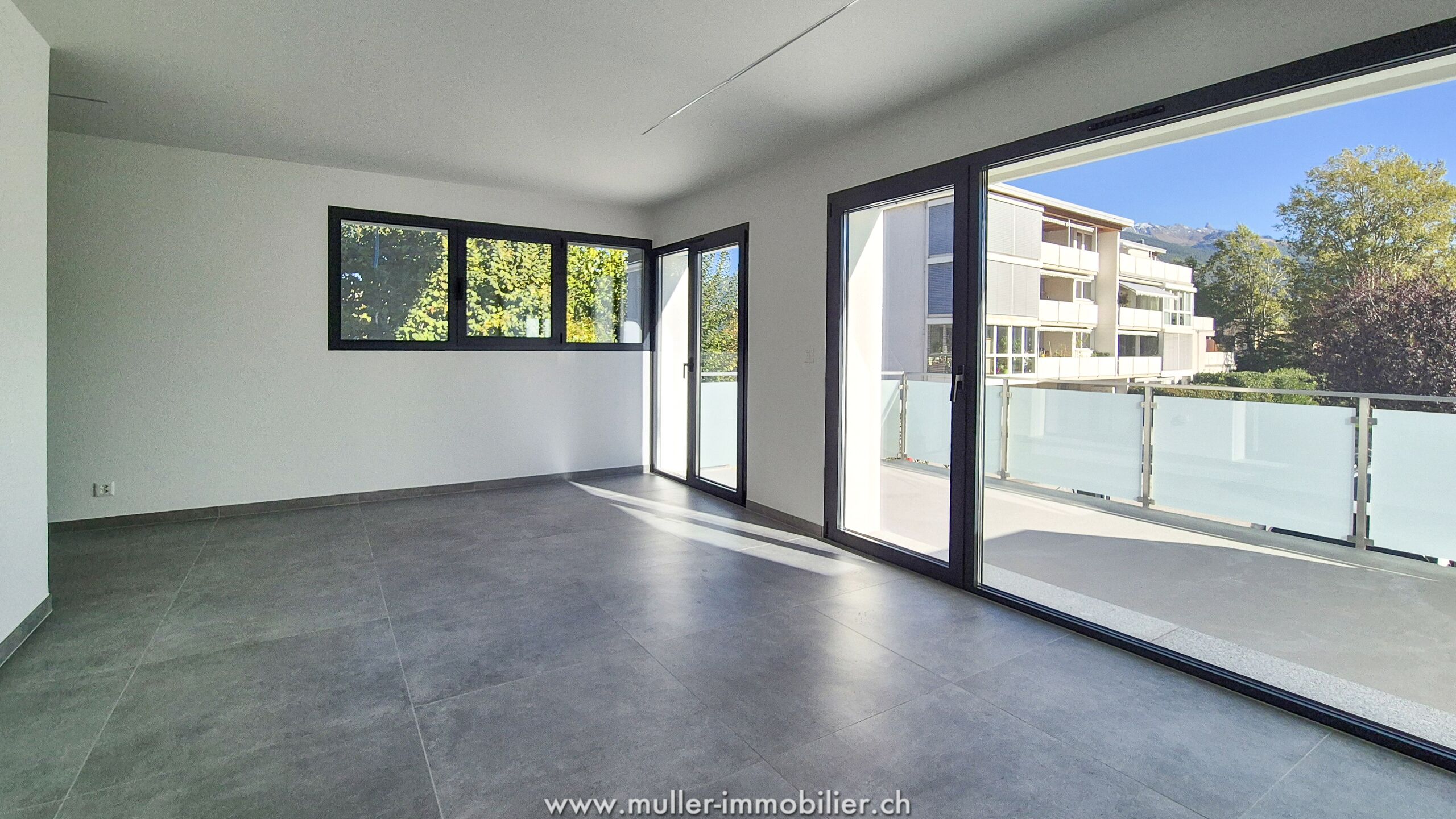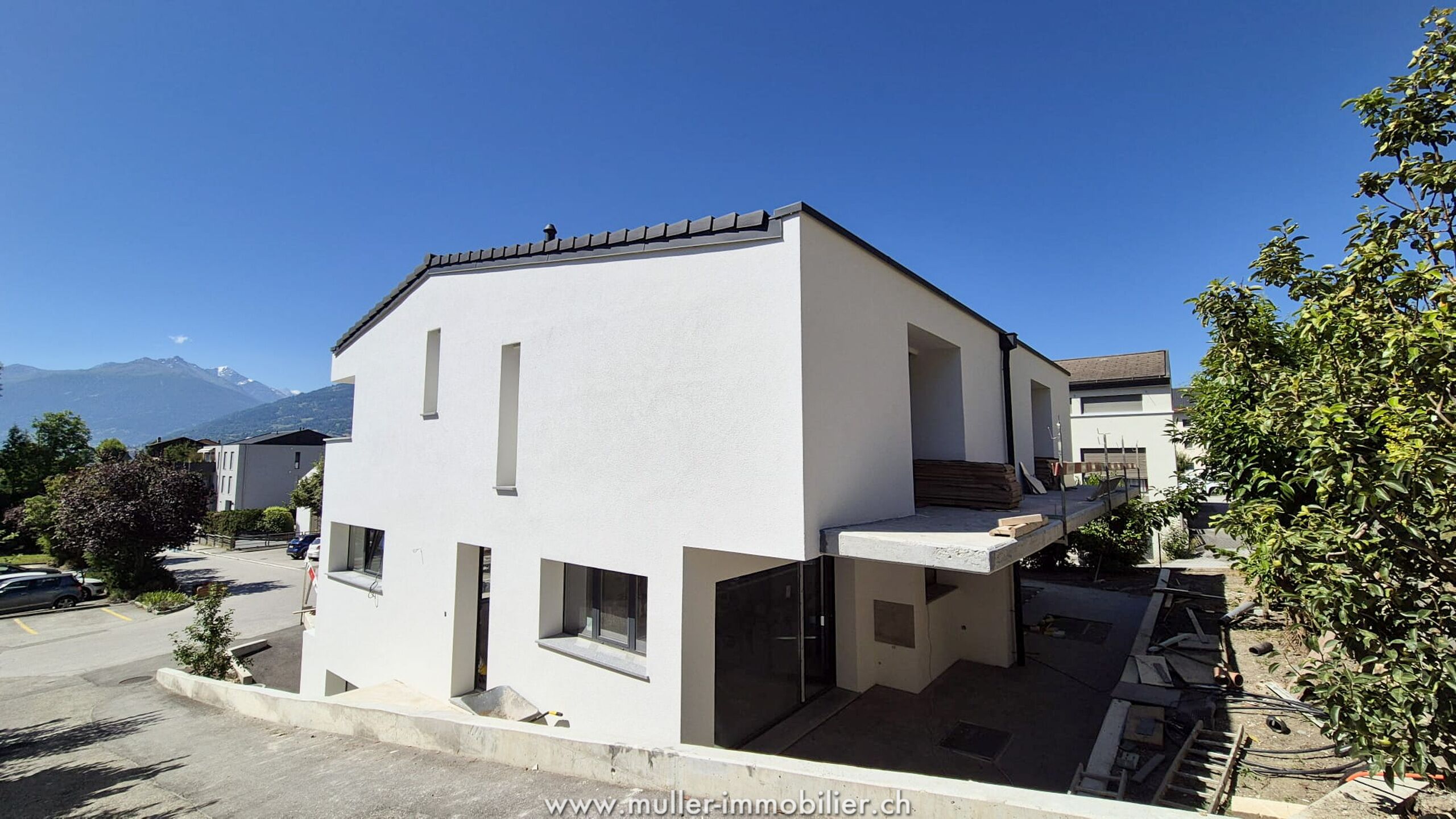 Superbe villa jumelle de 4,5 pièces et env. 131 m2 dans les hauteurs de Sion à Grimisuat avec grande terrasse plein Sud au rez-de-chaussée, une terrasse couverte avec un jardin à l’arrière et un balcon pour chaque chambre.