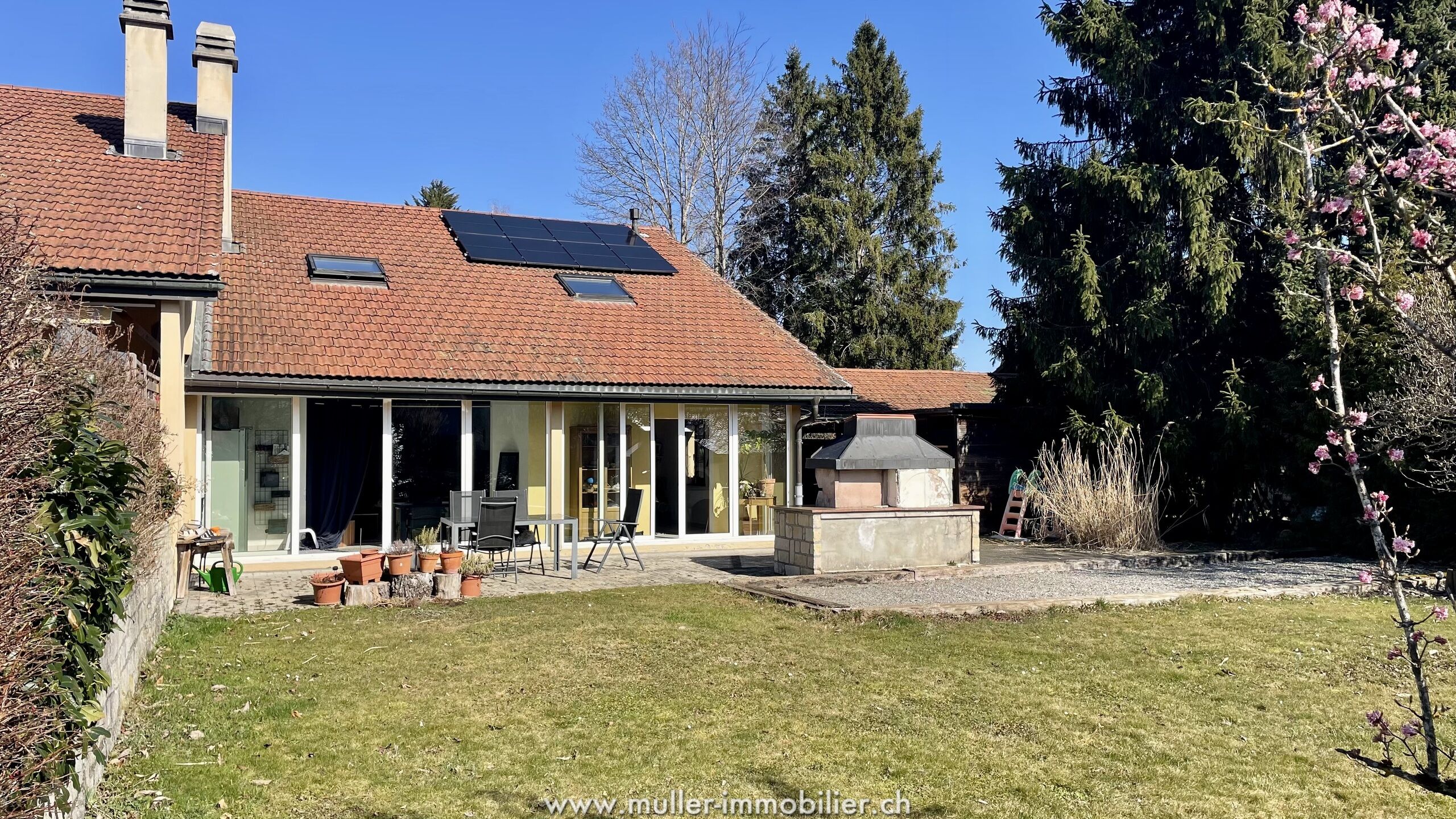 Grande parcelle arborisée, terrasse avec barbecue, garage, couvert à voiture, places de parc.